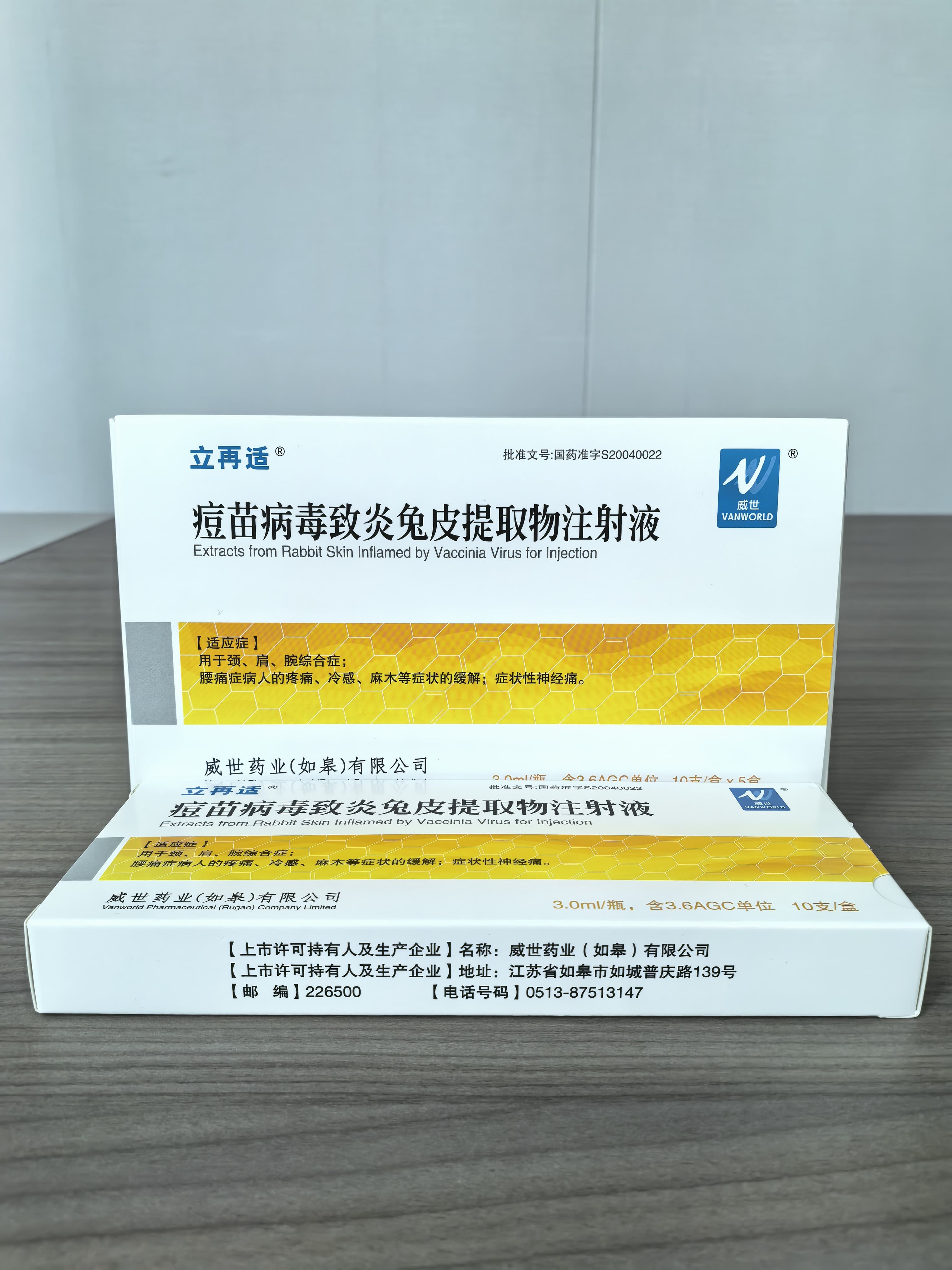 “痘苗病毒致炎兔皮提取物注射液”是由威世药业(如皋)有限公司生产的一种治疗类的生物制品。于2004年经国家食品药品监督管理总局(CFDA)批准(国药准字S20040022)开始在国内生产并销售。临床主要用于“颈、 肩、腕综合症;腰痛症病人的疼痛、冷感、麻木等症状的缓解;症状性神经痛”的治疗。